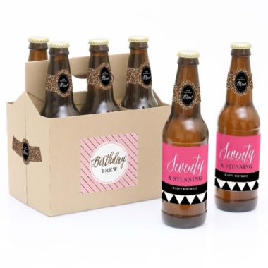 Big Dot of Happiness Chic 70th Birthday - Pink, Black and Gold - Birthday Party Decorations for Women - 6 Beer Bottle Label Stickers and 1 Carrier